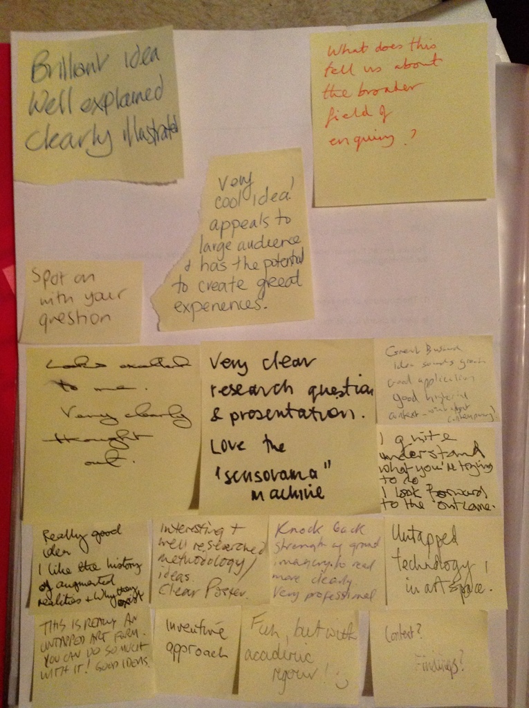 Photo attached with all the lovely post it notes that were stuck to my poster, and most people really like my idea, but I would like to ask the person who wrote, context, findings what they mean…