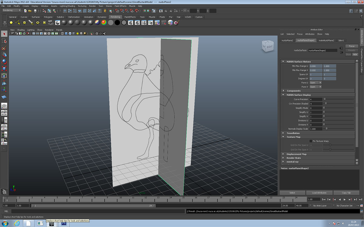 I spent most of last week watching MAYA tutorials on Lynda.com, this week, I start making my model. I liked one of the tutorials which used a line drawing to place all the elements of the character into a good relational model so have worked up a really nice side view with seperate components, or how I see myself making the model from more than one piece of ‘model’. This is the side view which I was able to closely follow from a fantastic photograph of a living Great Bustard.