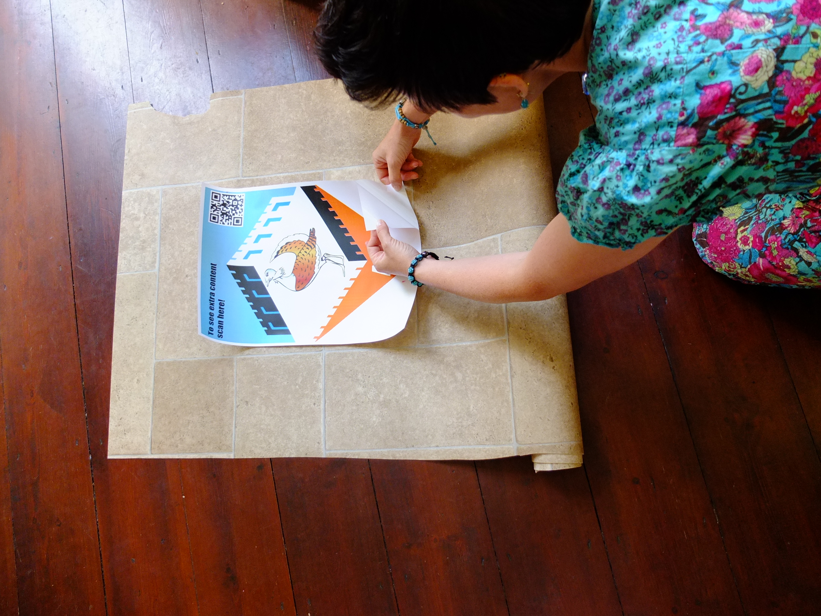 Looking at the vinyl media on the lino where parts tried to stick of course highlighted a problem that I hadn’t thought of, the wrinkle you get when you have a paper medium – no matter how thin – when rolled up, will always wrinkle, so printing directly onto the end media will be the only realistic solution, but perhaps, the vinyl media applied directly to the floor would be the best as it would be super thin, but of course I can’t do that in the Museum as this is only a test piece…