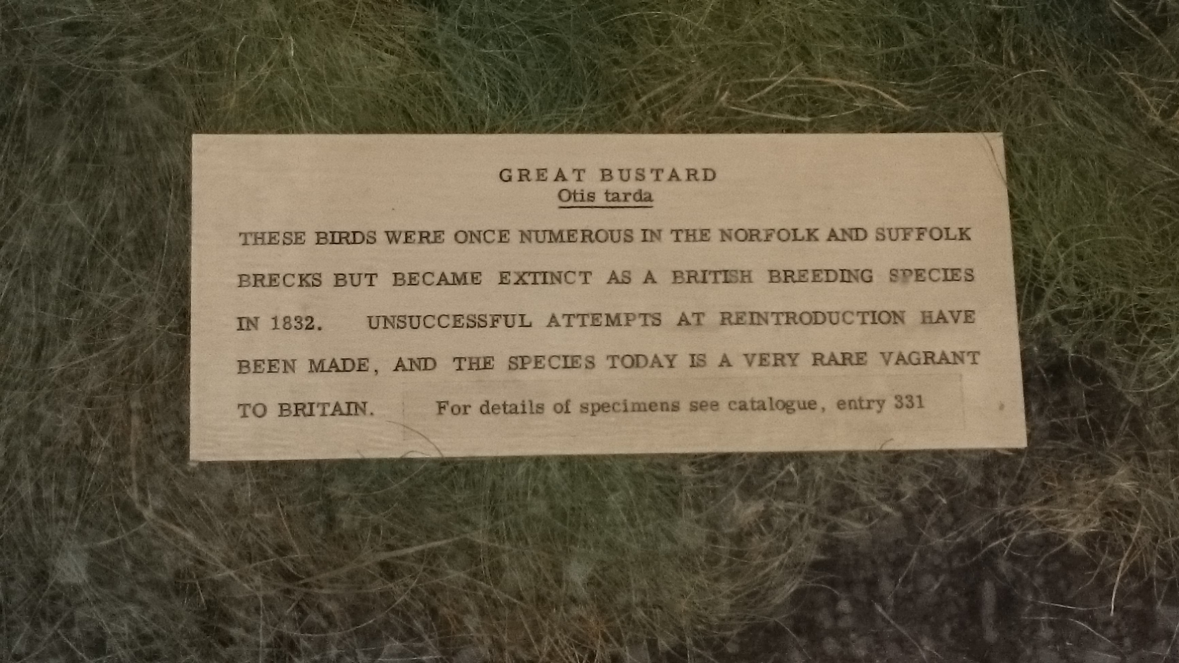 Label reads: Great Bustard, Otis tarda: These birds were once numerous in the Norfolk and Suffolk Brecks, but became extinct as a British breeding species in 1832. Unsuccessful attempts at reintroduction have been made, and the species today is a very rare vagrant to Britain. (this label is used in the Great Bustard display in the Norwich Castle Museum)