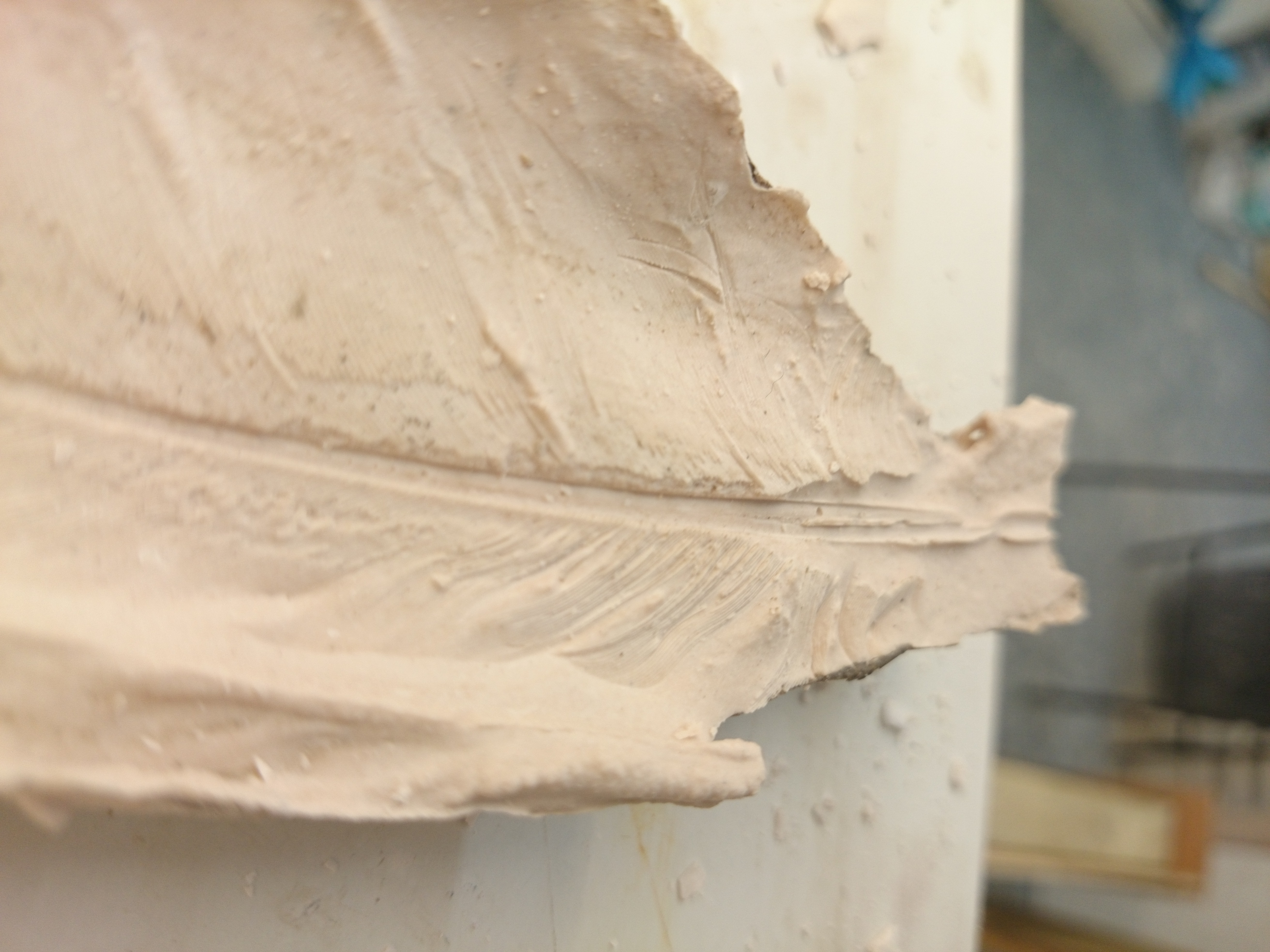 Friday was my first opportunity to get into the 3D workshop and I wanted to try 3 things, carving polystyrene, skimming the polystyrene with plaster to see how smooth I could get it, and somehow getting feather texture into the plaster itself.