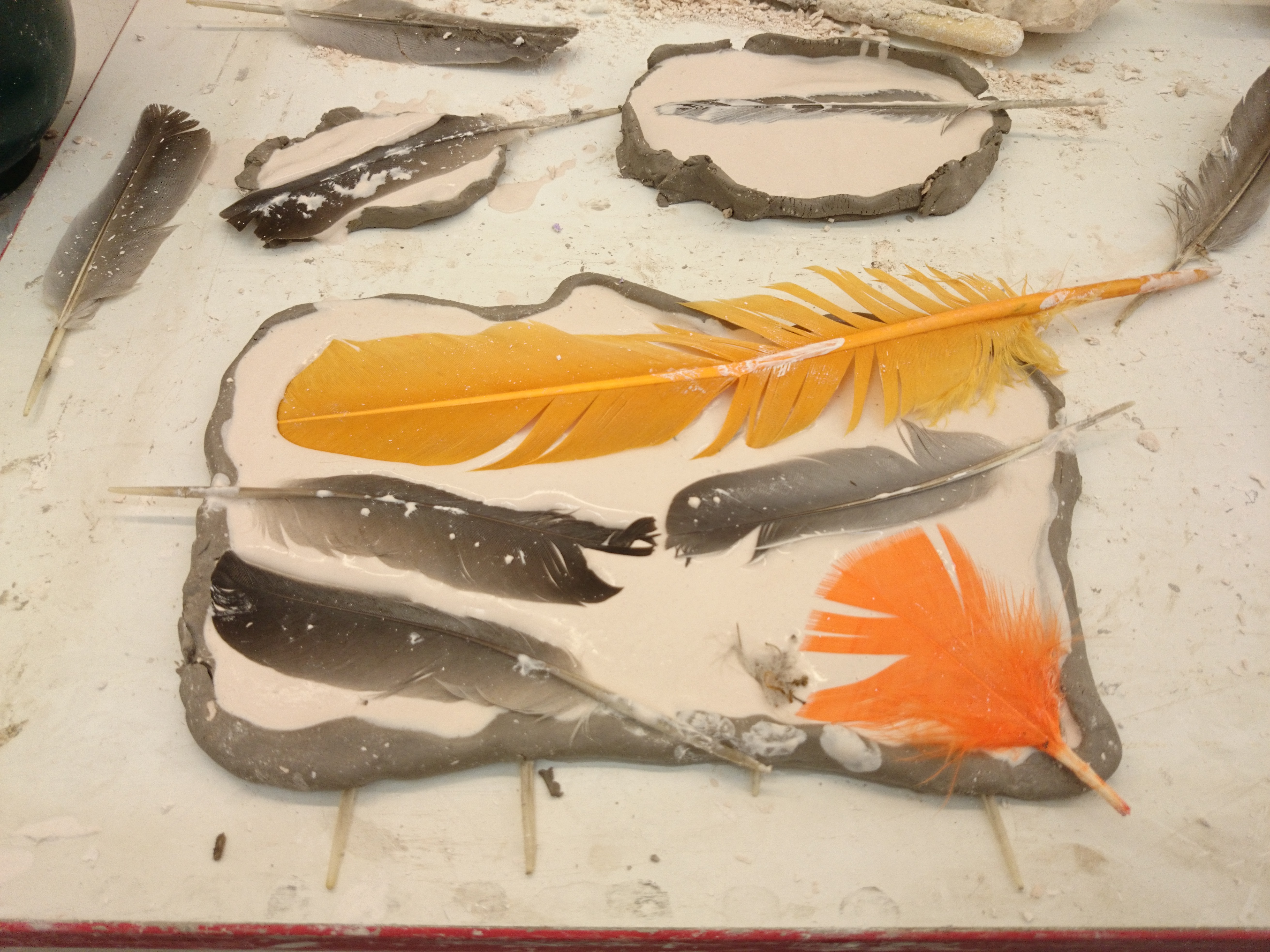 Then i used the thick plaster to try and get feather prints into, but that has mixed results, so a final test perhaps using plaster to impress and making a plaster mould from that would be more succesful.. but this I won’t know until next week when I can get back into the studio and release the plaster from their moulds, as it wasn’t quite set when the 3D studio was closing..