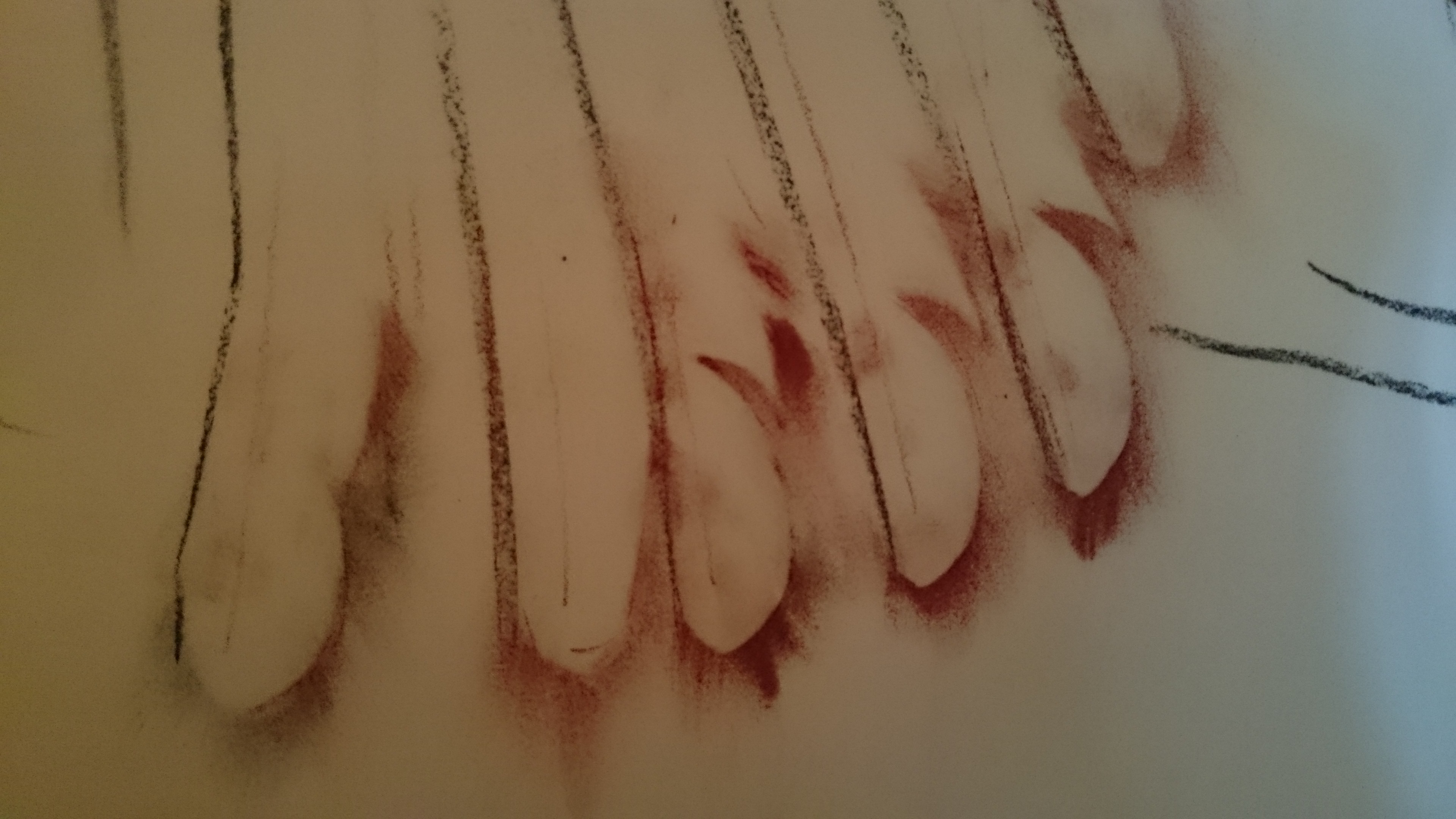 So I began working in the feathers and simple lines and another problem rears up, because I am working on an upright easel, the powder tends to ‘drip’ down the page, unlike my primary experiments when I was working over the top of my page.