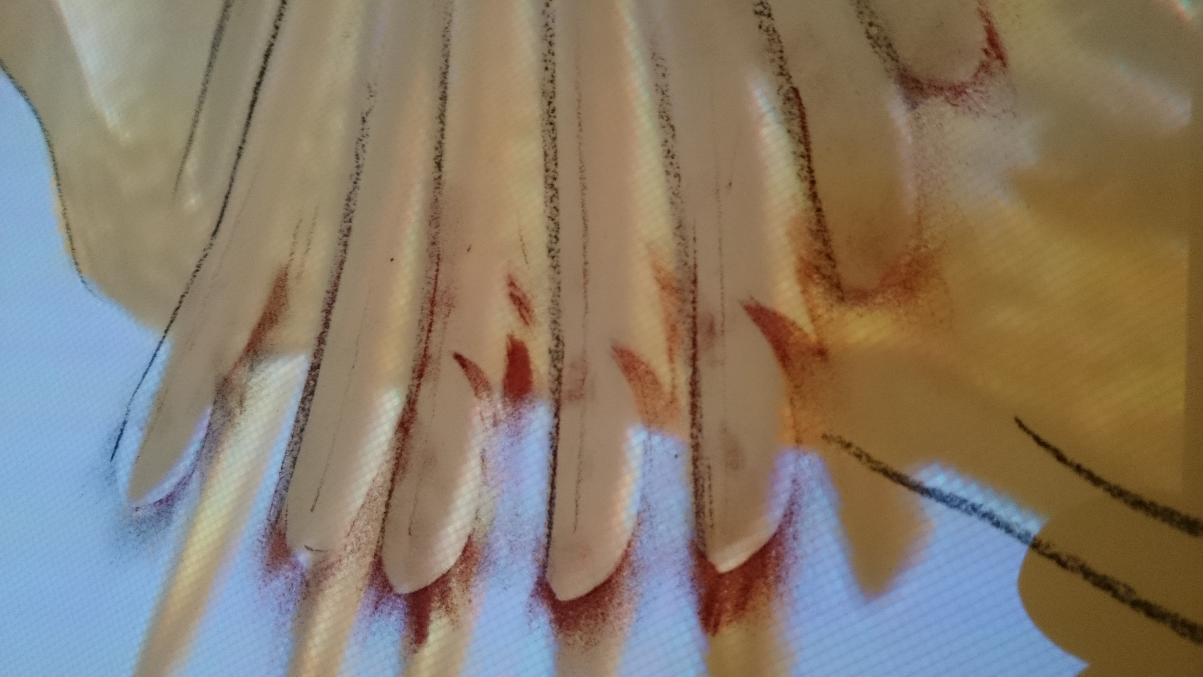 So I set all of these items out next to my computer so I could control what was projected and started on the newsprint paper that I love using for Life drawing… and here was my first problem, the newsprint really doesn’t take the powder I sweep onto the feather and onto the paper to make the relief imprint…