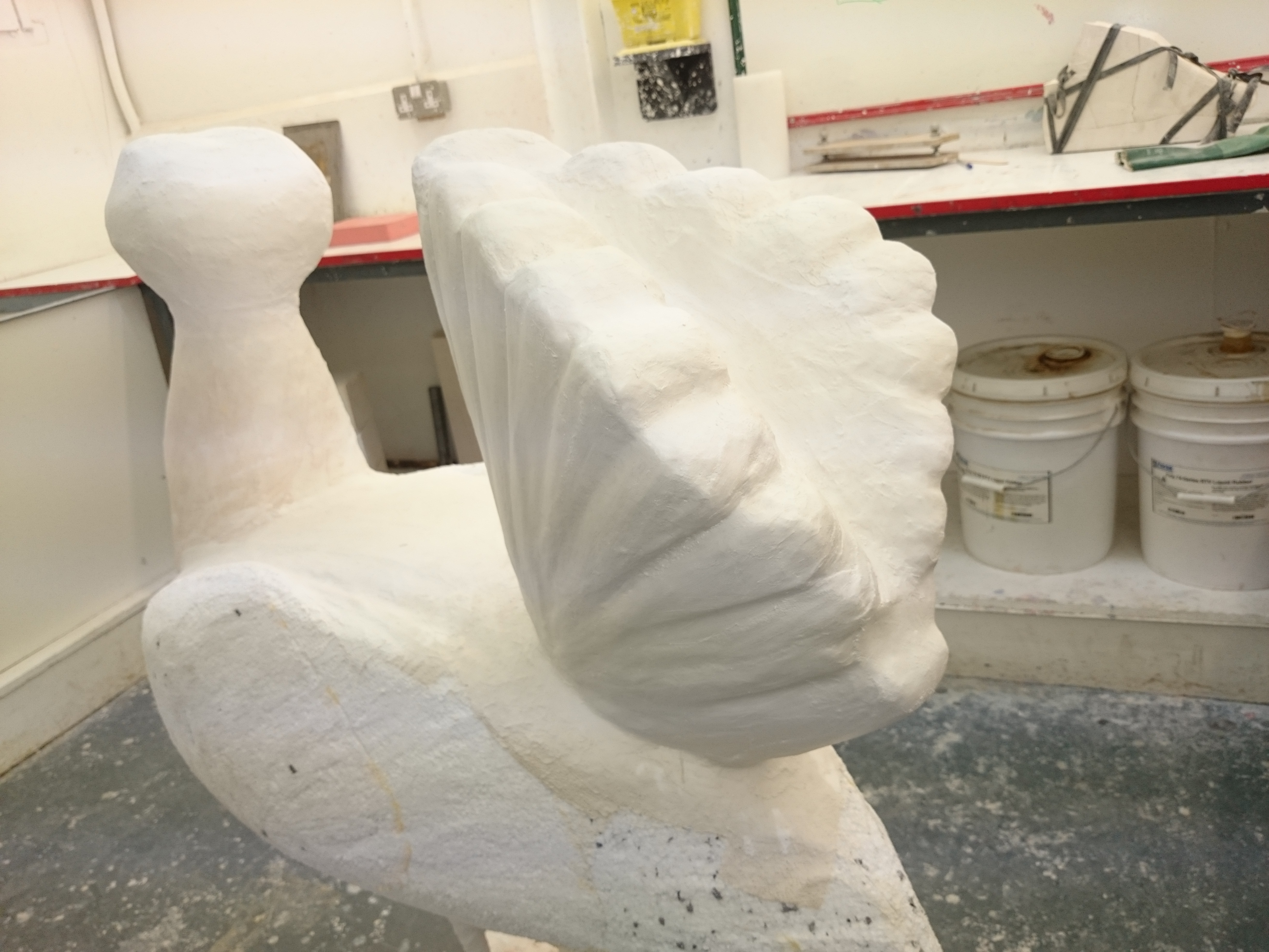 I work methodically along the tail, doing two sections at a time and cutting the modroc to the right size, this works really well and I get a lovely smooth finish on the feather sections, if only I could have achieved this over the head!