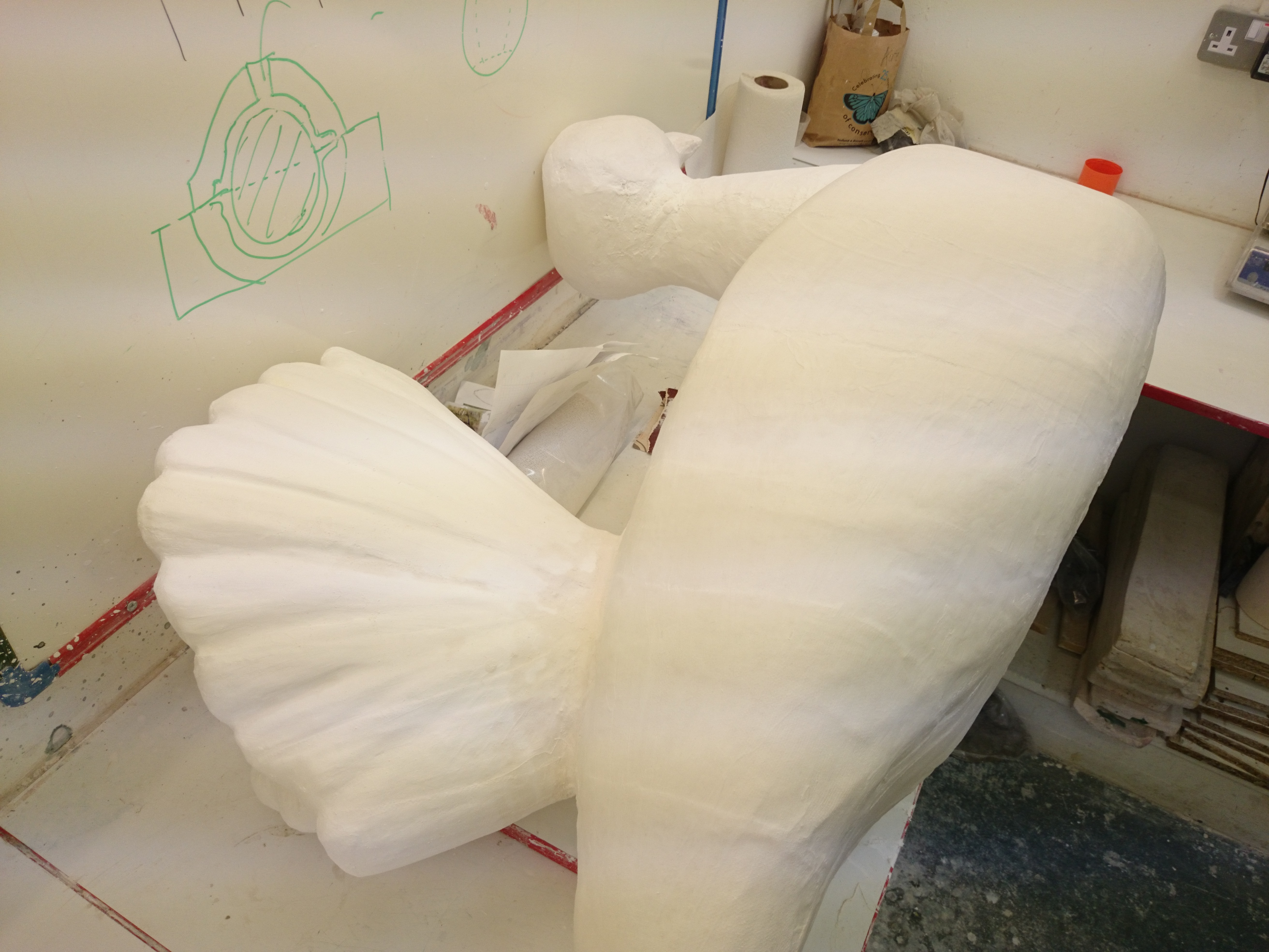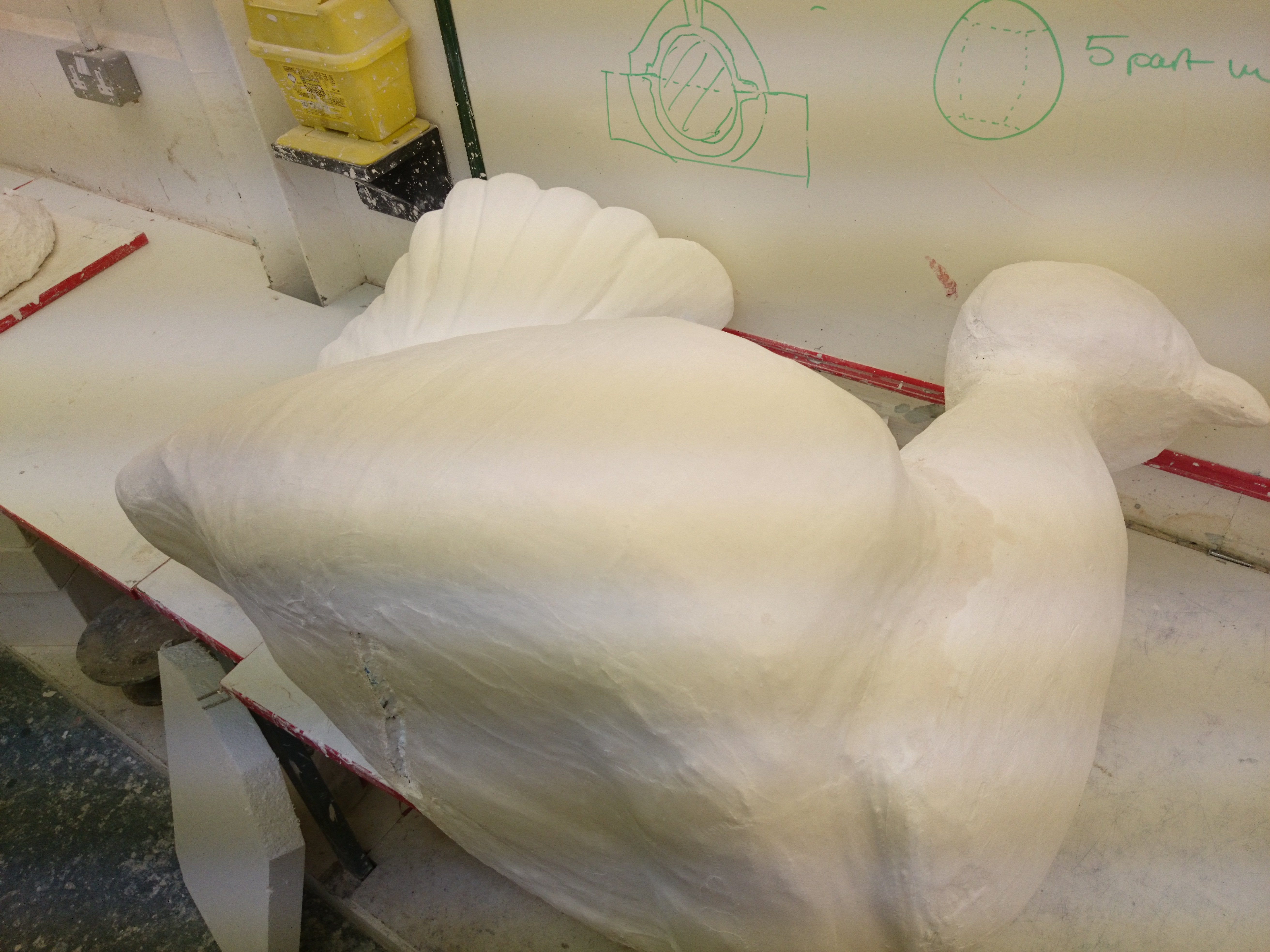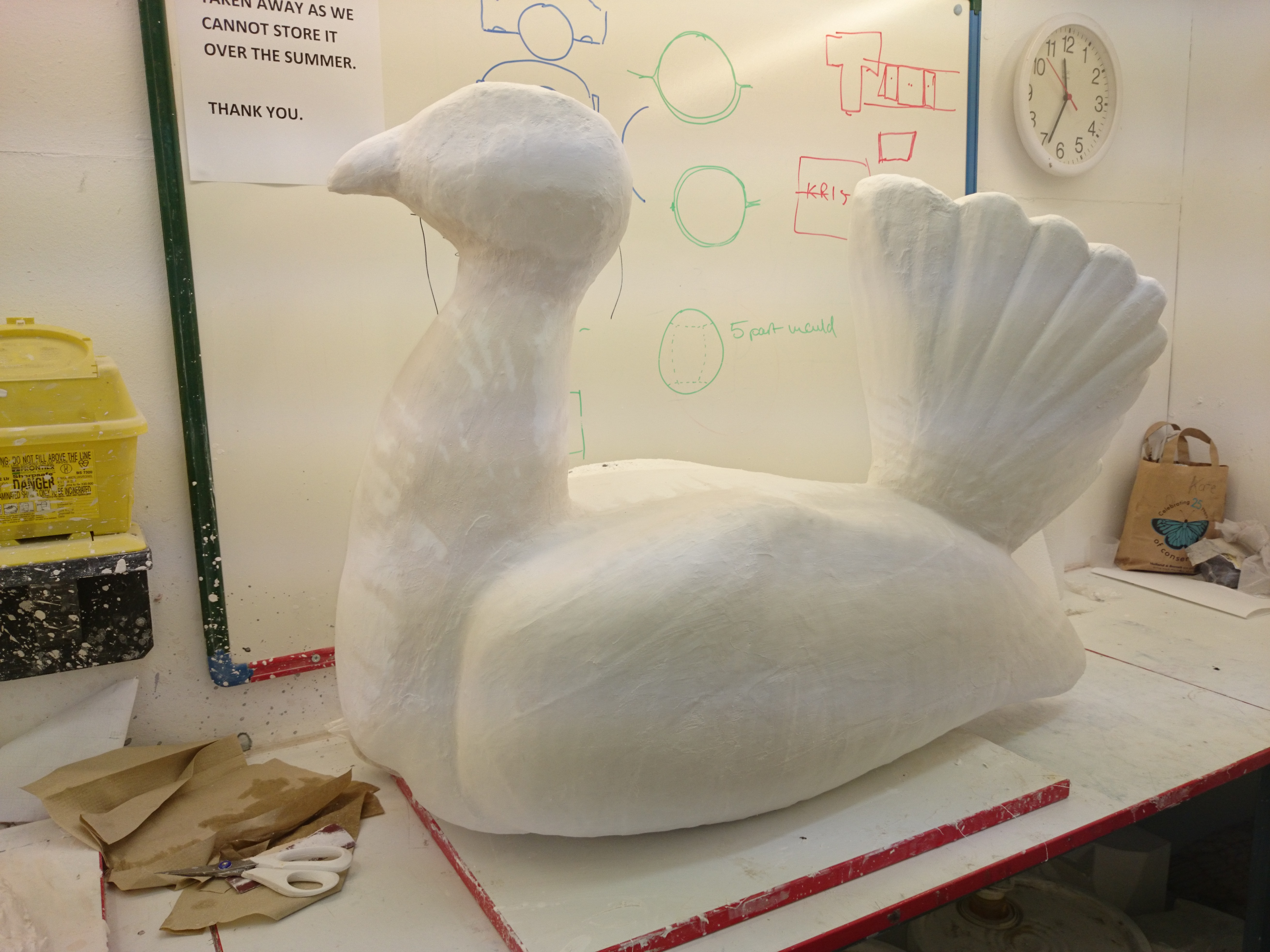 I turn the Bustard sculpture gently onto it’s side so that I can see both the bottom and the top, to try not to leave any nasty bits of unsmoothed bandage where I can’t quite reach. It is pretty tricky as the benches are high, and the Bustard is big, even on it’s side and after taking all morning to cover it I have left a couple of dodgy edges where you can clearly see the bandage.