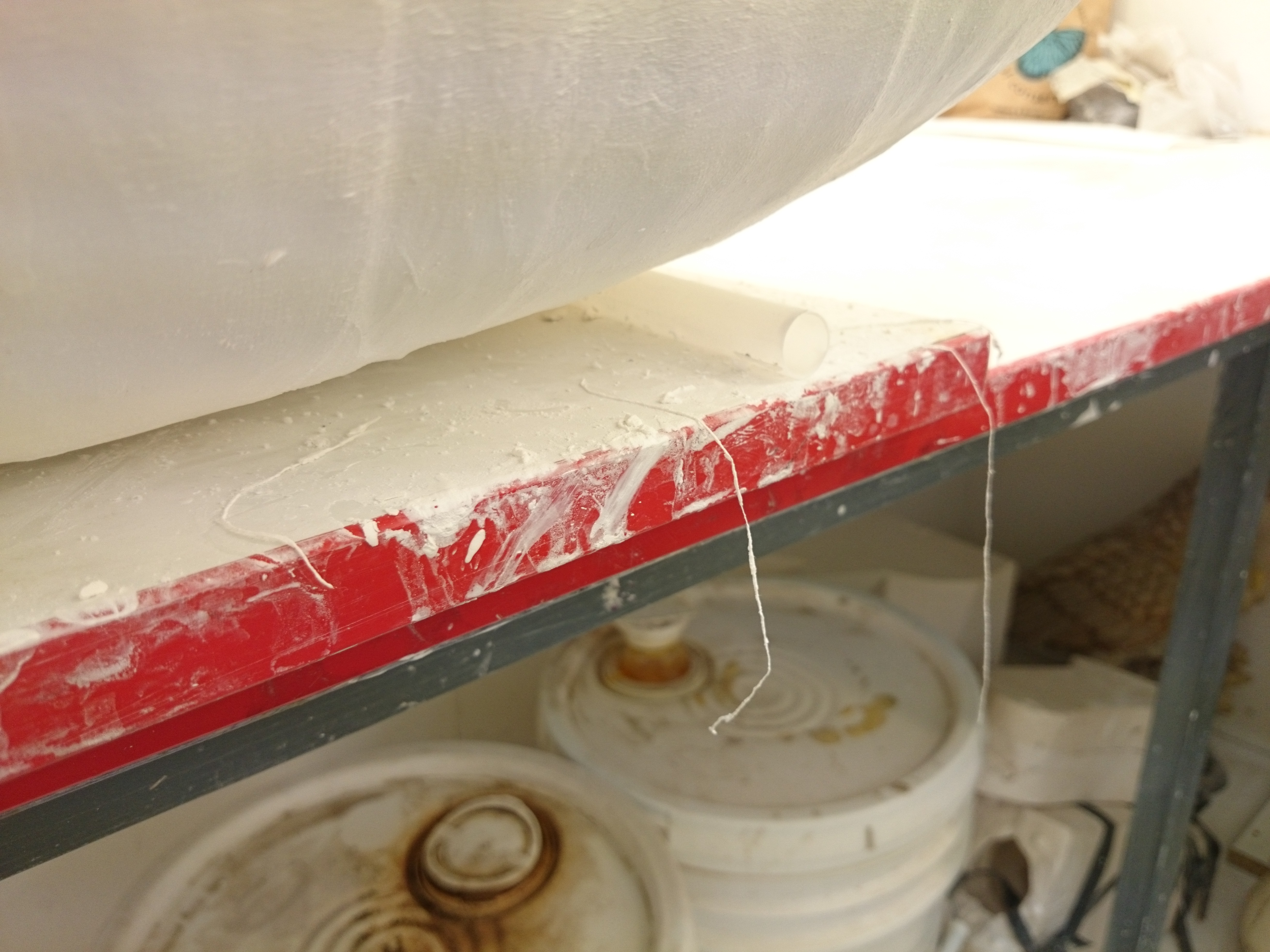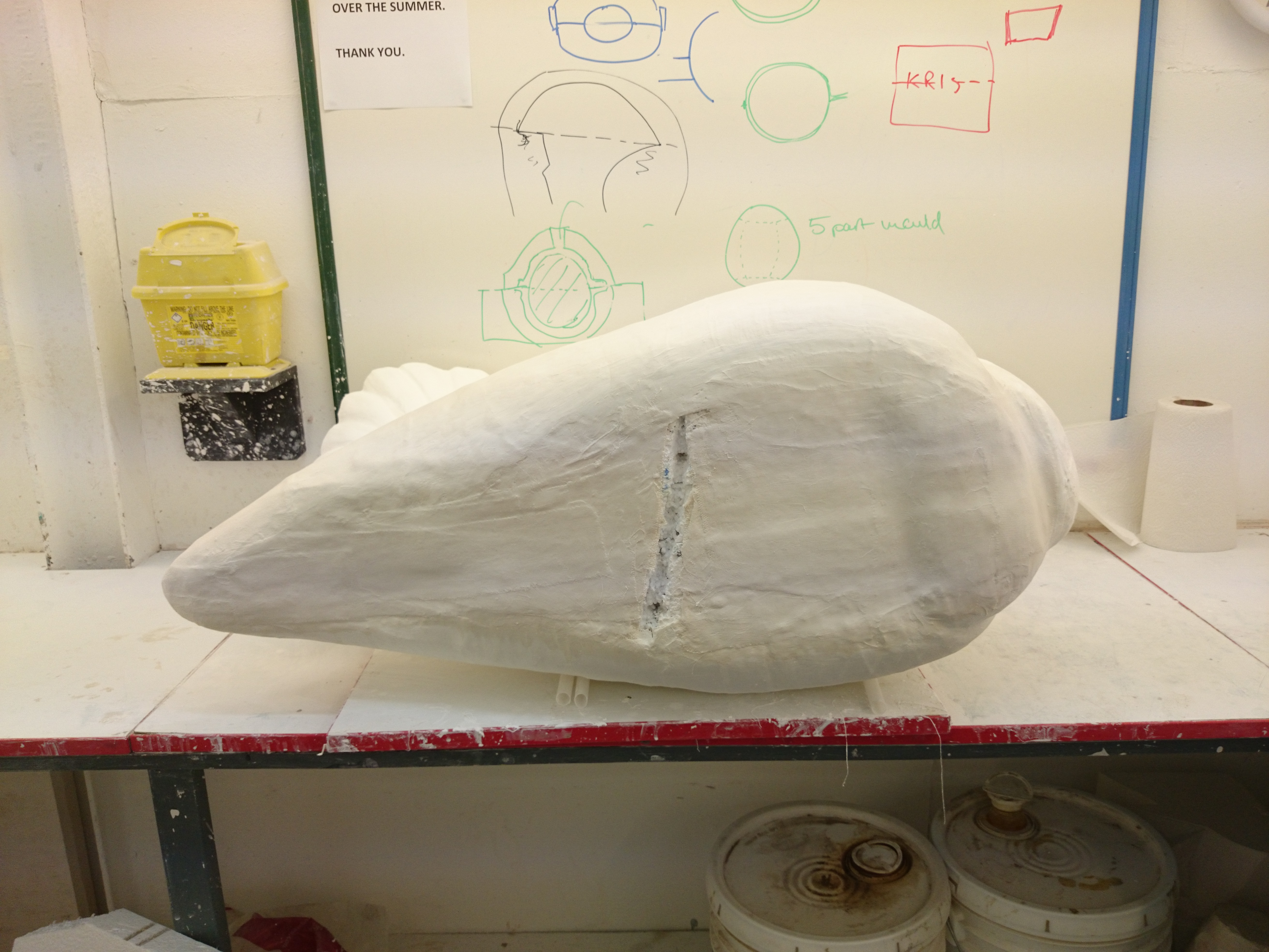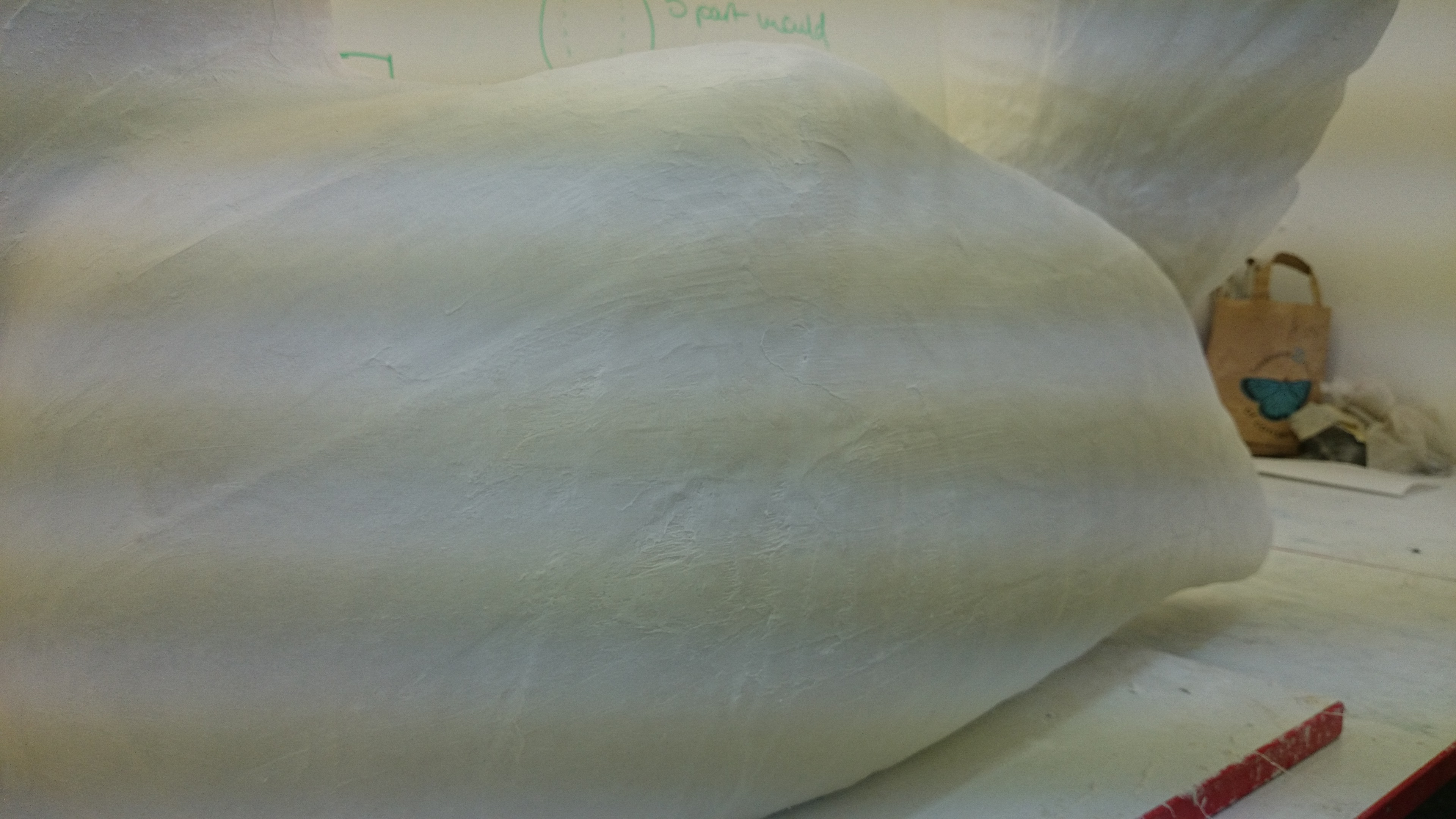 The next morning I get, it’s onto the other side, I try and randomise the layering of the modroc as much as is possible, but I’m still not able to smooth it as much as I’d hoped and the little pieces of modroc string falling off coupled with polystyrene bits in the mix are driving me crazy!