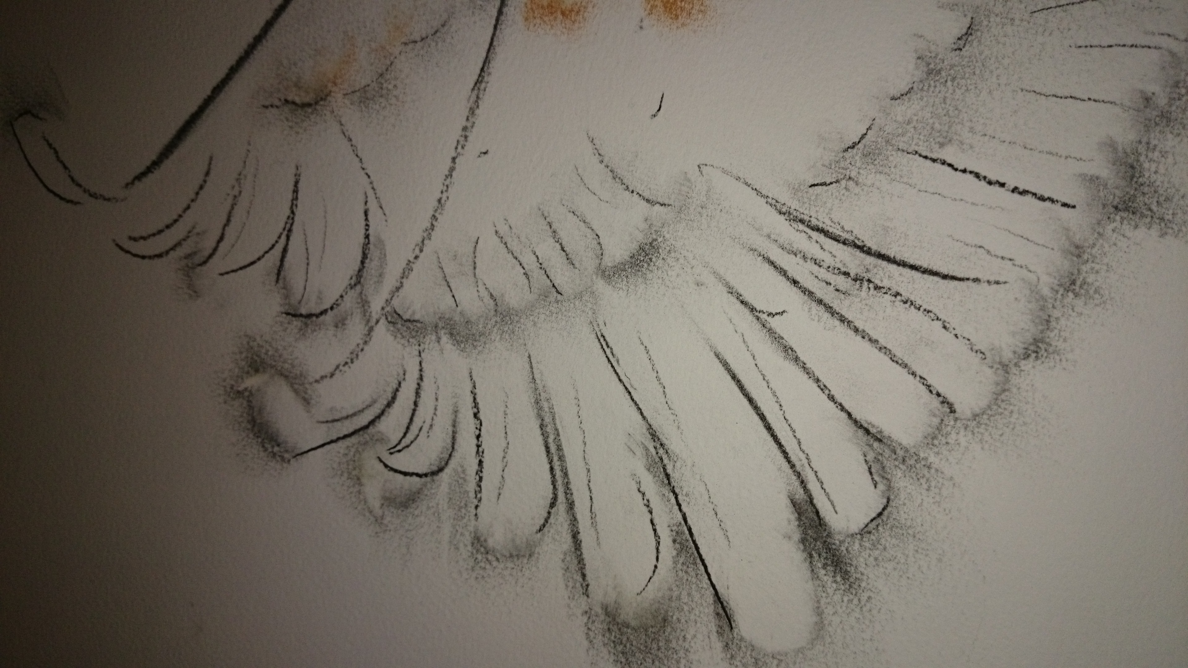 To make the texture as exciting as possible I had discovered through more experimentation that using found feathers in the animation frames made such particular marks that I could not replicate, or better, by hand. It seemed fitting to be using them to animate flight.