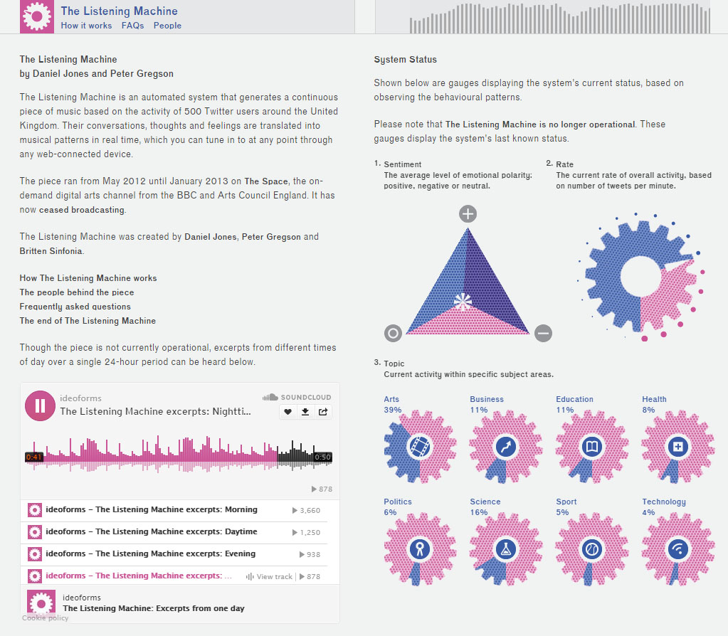 More and more intelligent and dynamic interactions can happen within today’s browsers and networks, when I visited the Digital Revolution at the Barbican in London last year, there was an audio piece by Zach Lieberman called Play The World, where you could play international radio-stations on a piano. Each key makes the system listen to radio around the world to find one playing that particular not, then feeds that radio station onto the speakers.