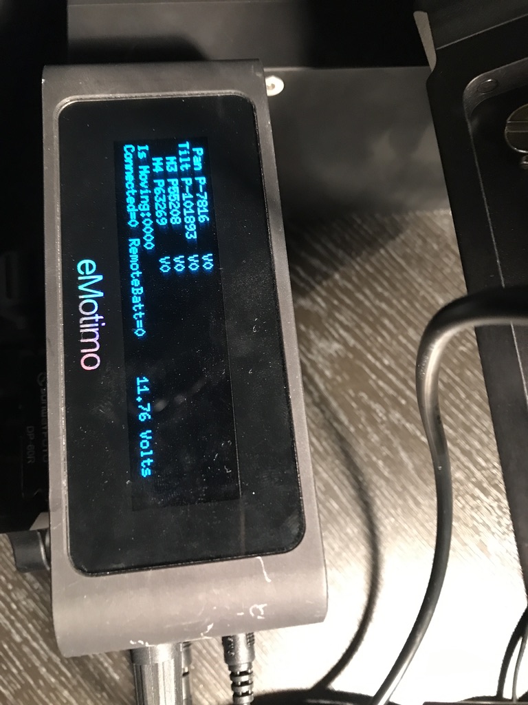 Leaving the wireless remote off and using the 8Way switch, Go to Settings menu, ensure on page 2, Dragonframe is selected, then then right (pushing back on the 8Way Hat), two times until the following screen appears – this is live motor feedback and mode where Dragonframe positions and commands are processed.