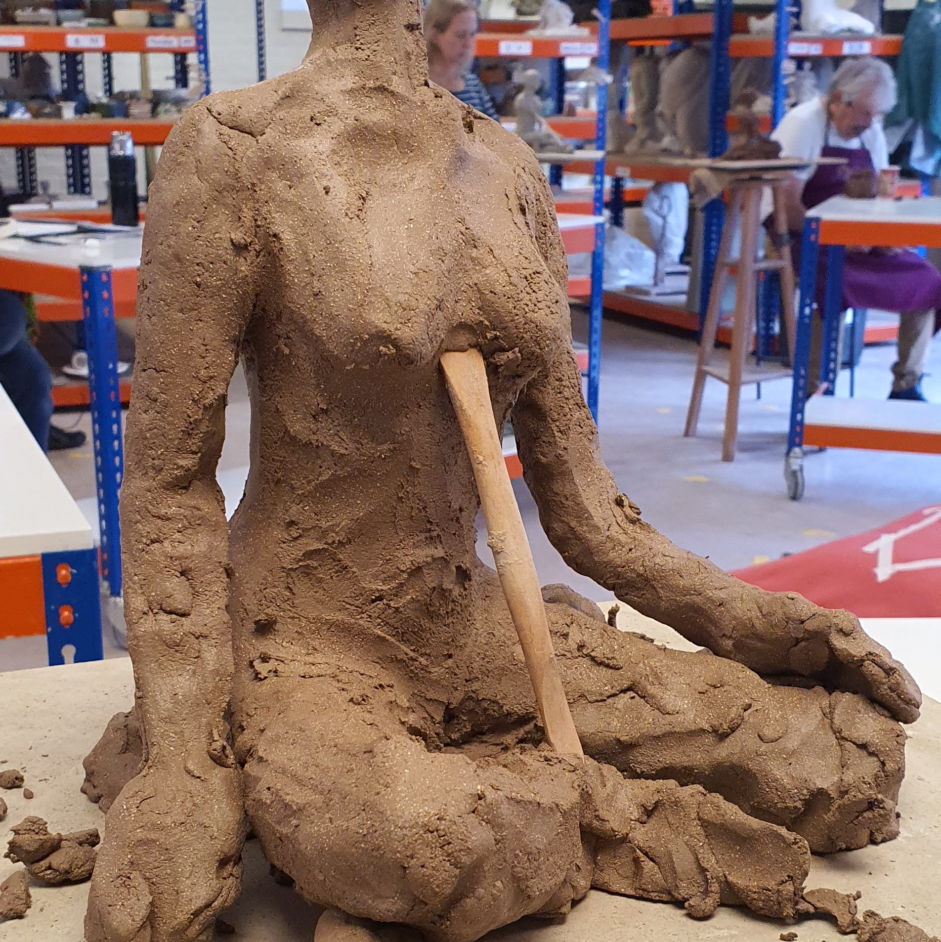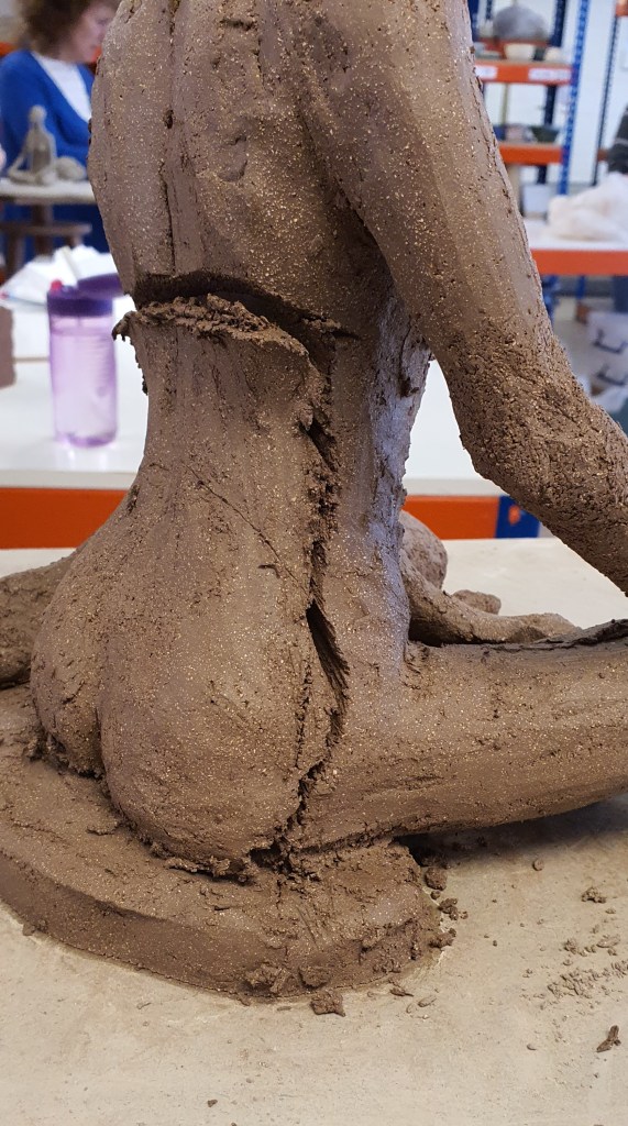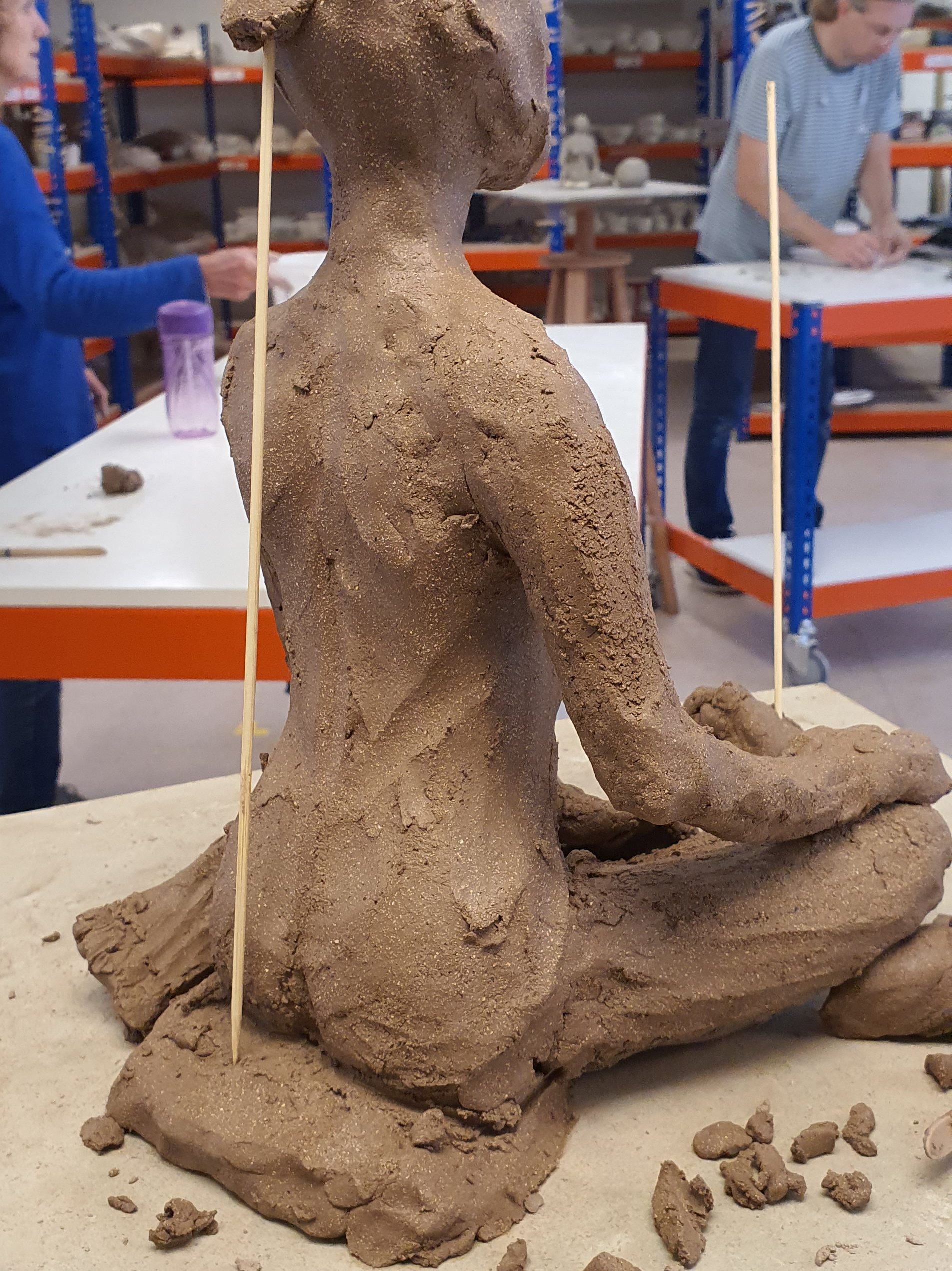 Coming to the end of the day I was really worried about adding a head on because of the extra weight but also if I didn’t add it this week I would have to wait a week and then adding wet clay onto slightly dry clay could make a weak spot. In the end I did add a big enough lump of clay for the head, but needed to prop it up on skewers in the hope it would be ok for the following week!