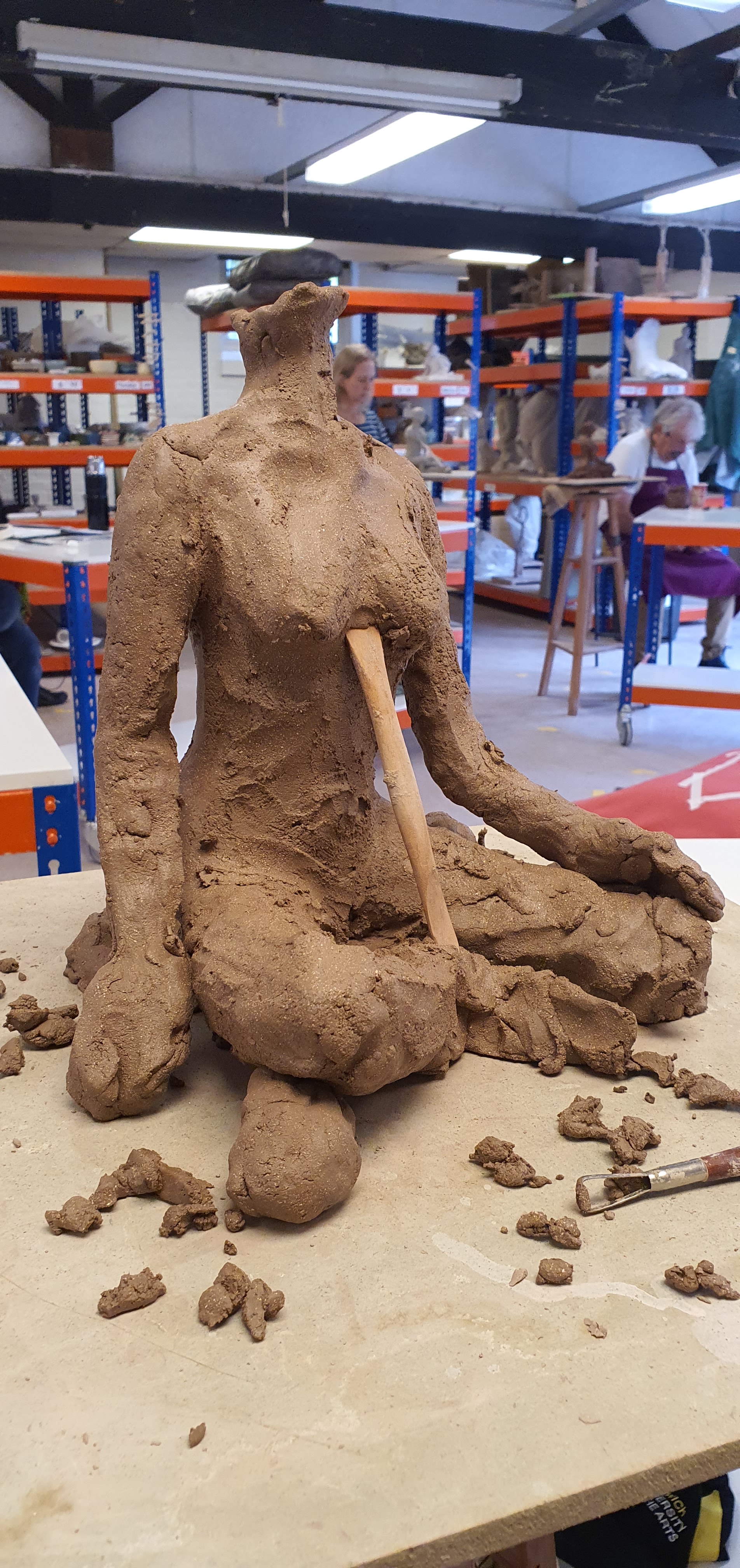 Coming to the end of the day I was really worried about adding a head on because of the extra weight but also if I didn’t add it this week I would have to wait a week and then adding wet clay onto slightly dry clay could make a weak spot. In the end I did add a big enough lump of clay for the head, but needed to prop it up on skewers in the hope it would be ok for the following week!