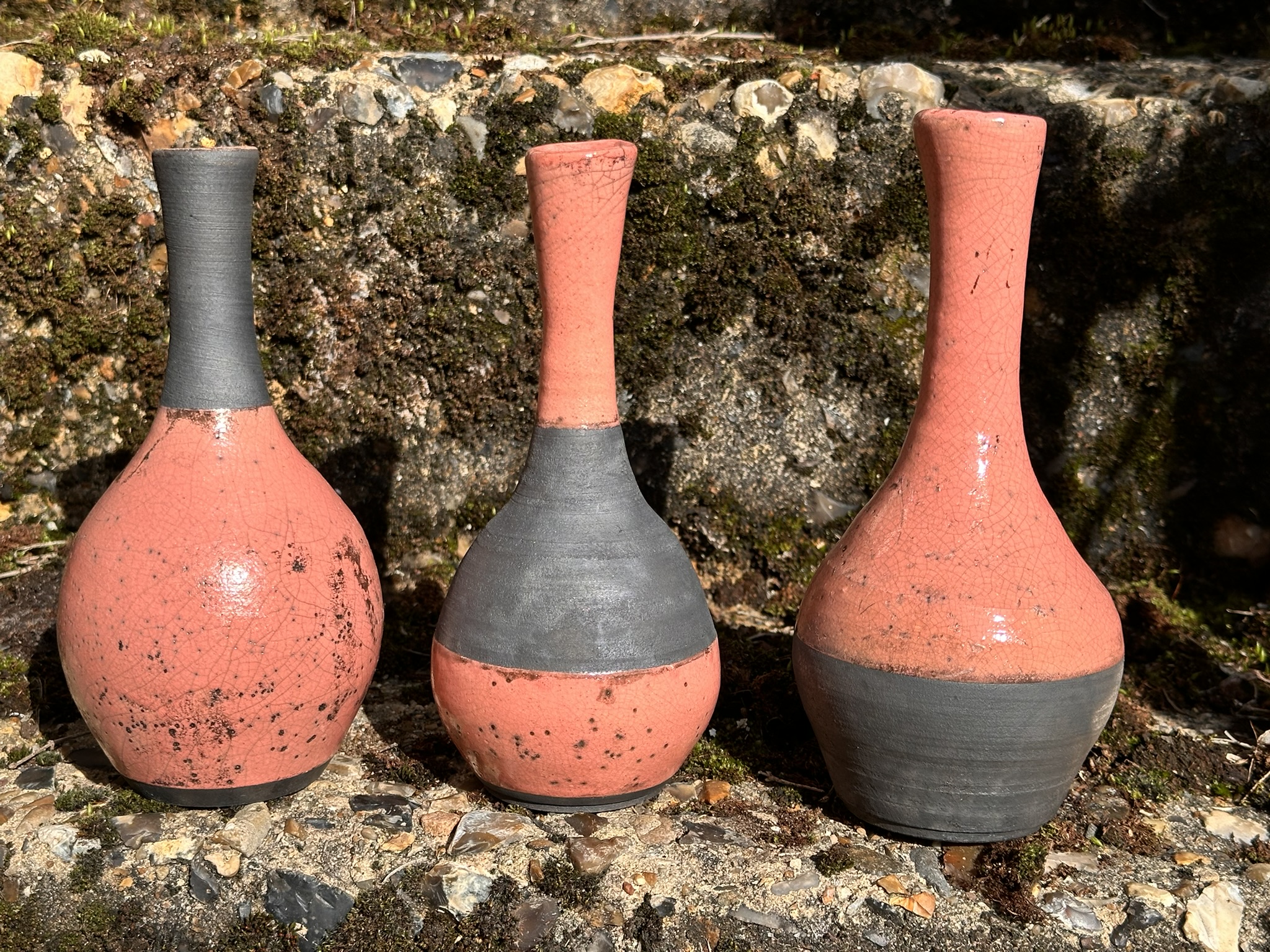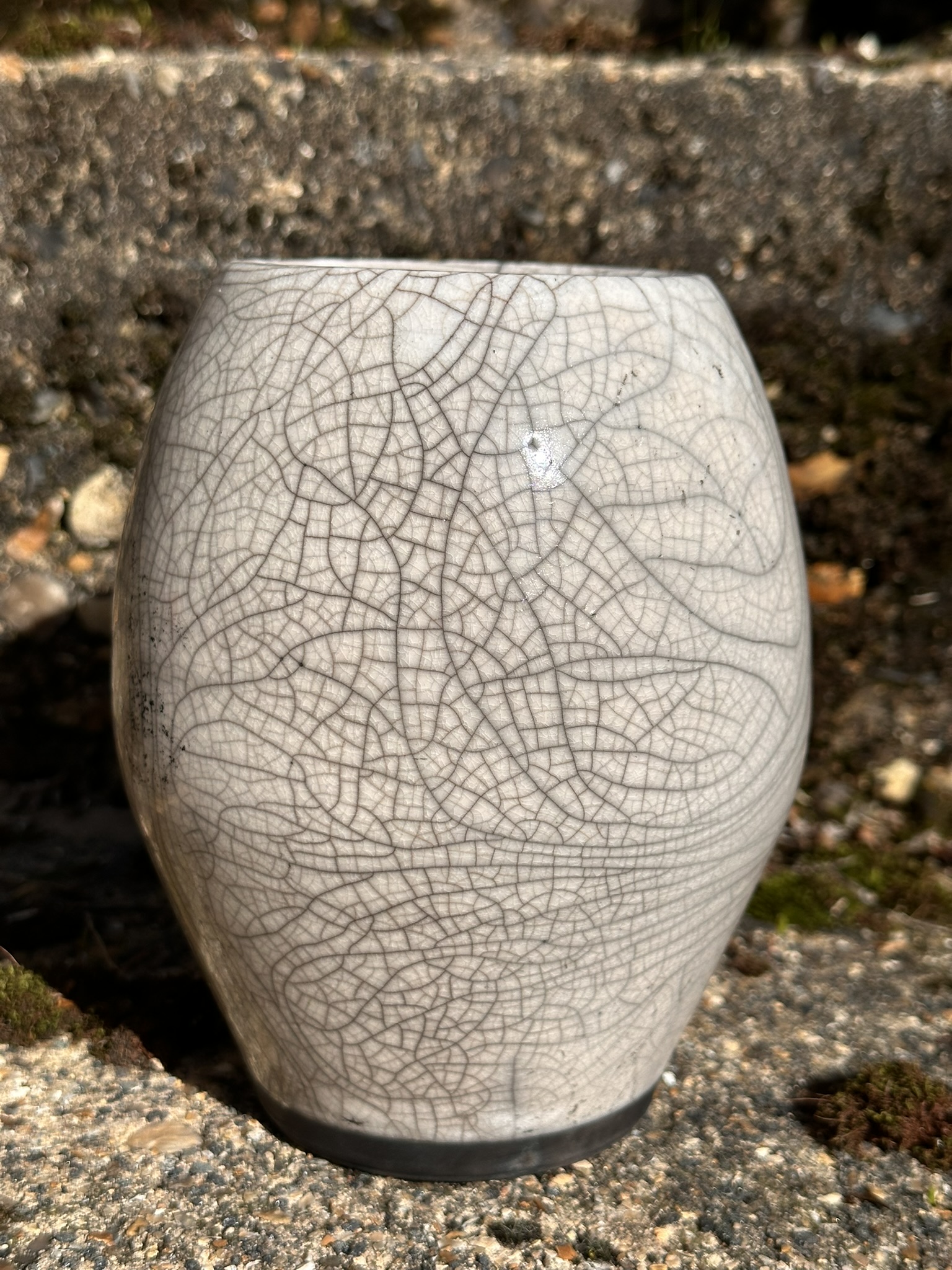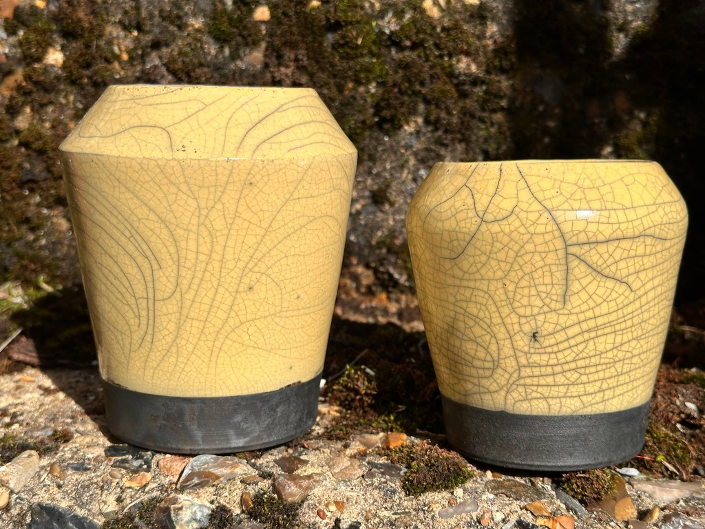 I love the typical big black spiderweb of cracks that Raku and it’s special glazes can achieve on the outside surface of ceramics and after a successful first firing of my kiln back in November, I expanded some of the shapes to make little sets of cobalt, yellow, pink and the traditional ‘white’ crackle. (It’s actually not ‘white’ crackle on my pots, the clay is white, the glaze is transparent and the crackle shows up in the carbon reduction process.)