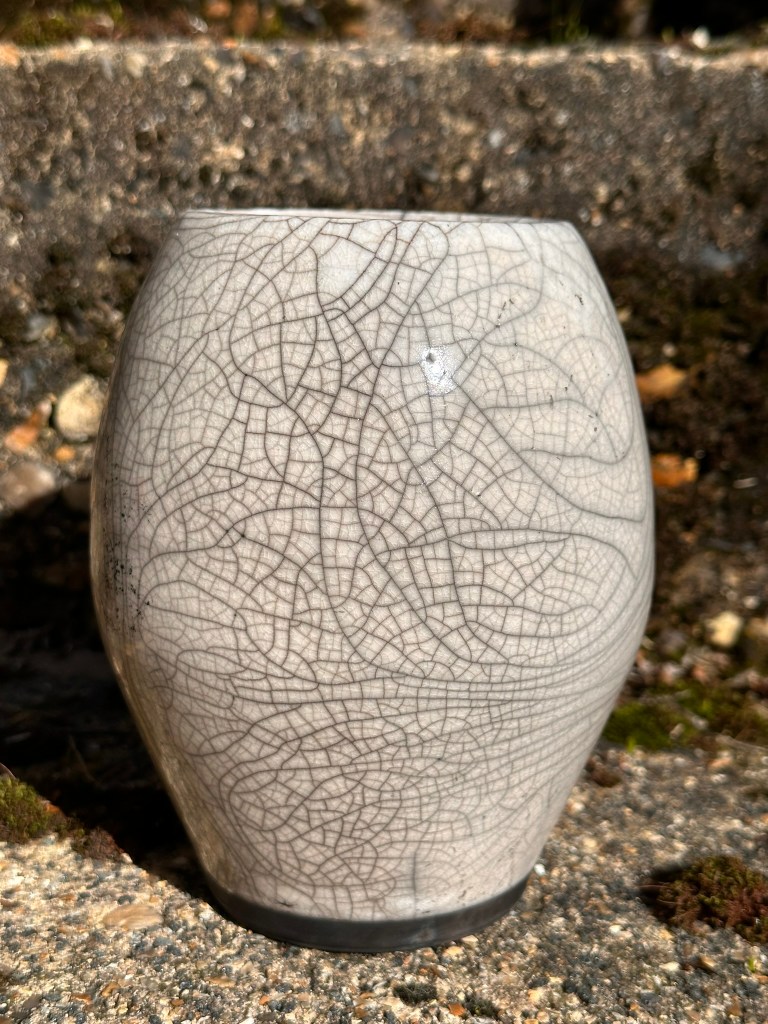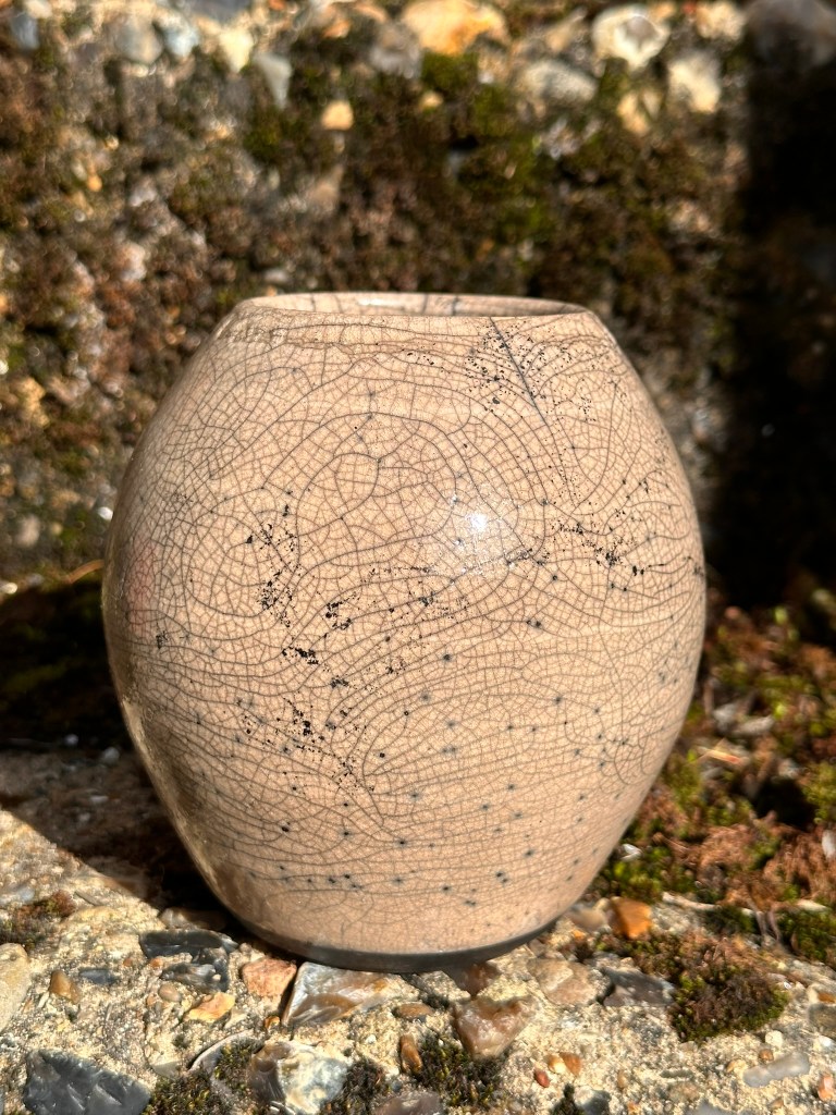 Raku is one of the most exciting processes in pottery making, after a normal electric kiln bisque fire, you can glaze, fire up to 1000 degrees Celsius and be handling the pot within just a few hours and the gorgeous crackle that you can get – with some good luck – is a fabulous reward.