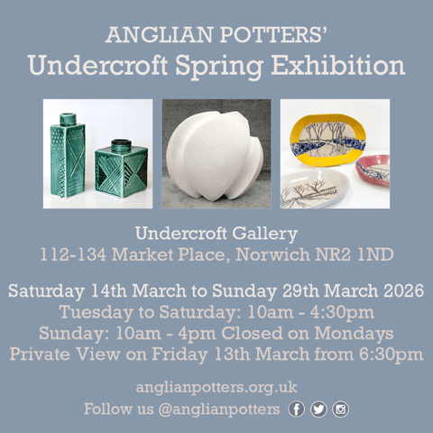 I joined the Anglian Potters primarily as a place where I could meet other potters and geek out about nerdy clay things, but one of the things they encourage you to do is to take part in some of their exhibitions. They happen all over East Anglia and even though I have a little bit of imposter syndrome, I have again pushed myself to get a little selection of pots together to put forward for their Norwich Spring exhibition that takes place in the Undercroft Gallery in the centre of Norwich.